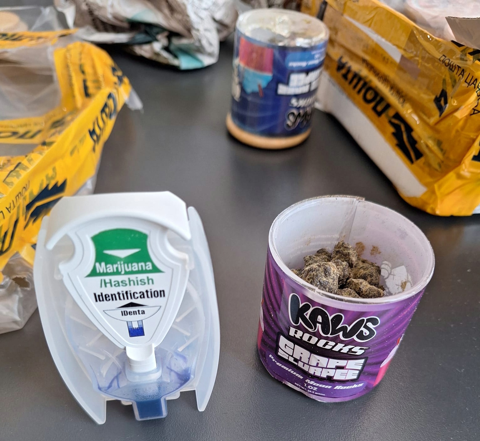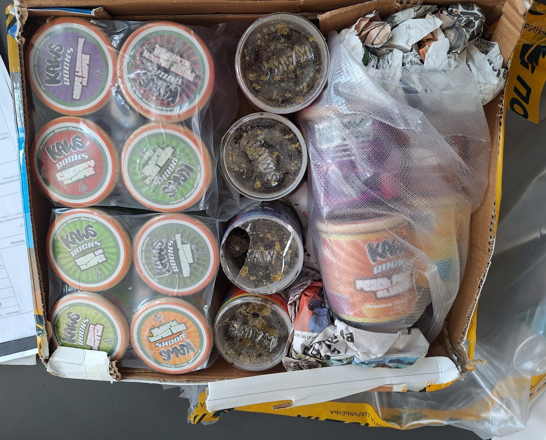 U njoj se nalazilo 16 staklenih teglica sa natpisom „Kaws rock grade slurpee“ ispunjenih sasušenom biljnom materijom, koja je priručnom analizom odreagovala na marihuanu.