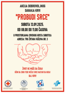 Crveni krst Subotice u subotu, 13. septembra, od 8 do 11 časova, u prostorijama gradske organizacije, po peti put organizuje veliku tradicionalnu akciju dobrovoljnog davalaštva krvi „Probudi srce“ u saradnji sa Službom za transfuziju krvi Opšte bolnice Subotica. Podršku akciji daju i Zavoda za javno zdravlje Subotice i Dom zdravlja Subotica koji će svim donatorima dragocene tečnosti pružiti besplatne preventivne preglede, udruženje pčelara „Pčela“ obezbediće medeni obrok. Svi zainteresovani dobrovoljni davaoci biće u prilici da se registruju i u Bazu matičnih ćelija hematopoeze.