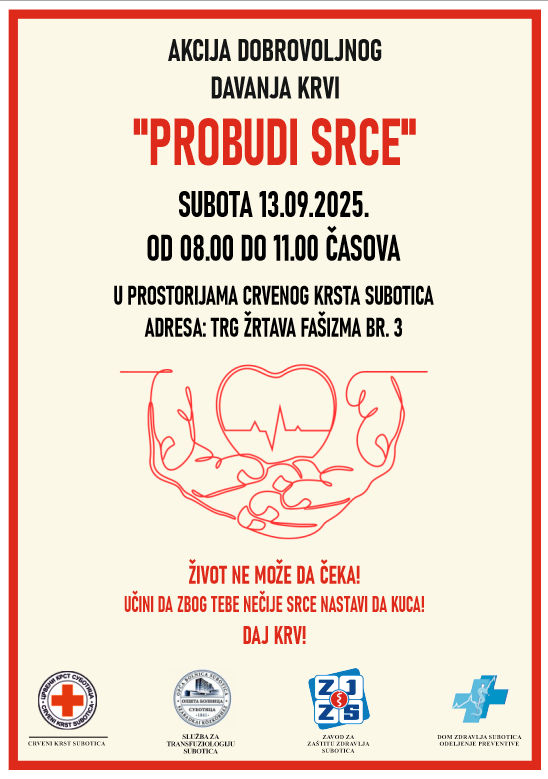 Crveni krst Subotice u subotu, 13. septembra, od 8 do 11 časova, u prostorijama gradske organizacije, po peti put organizuje veliku tradicionalnu akciju dobrovoljnog davalaštva krvi „Probudi srce“ u saradnji sa Službom za transfuziju krvi Opšte bolnice Subotica. Podršku akciji daju i Zavoda za javno zdravlje Subotice i Dom zdravlja Subotica koji će svim donatorima dragocene tečnosti pružiti besplatne preventivne preglede, udruženje pčelara „Pčela“ obezbediće medeni obrok. Svi zainteresovani dobrovoljni davaoci biće u prilici da se registruju i u Bazu matičnih ćelija hematopoeze.