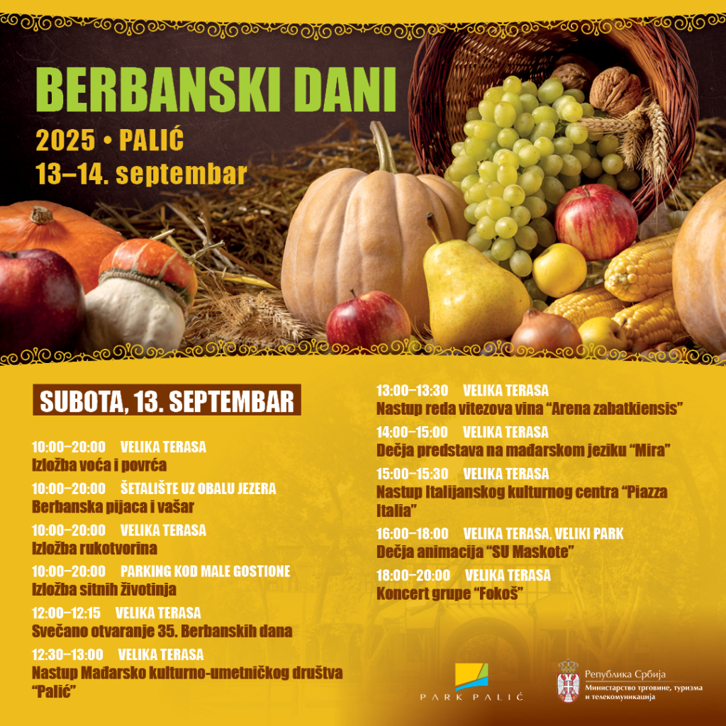 U čast berbe plodova iz naših krajeva i ove godine biće upriličena izložba voća i povrća, kao i izložba rukotvorina i sitnih životinja, Berbanska pijaca i vašar, nastupi Kulturno umetničkih društava „Mladost“, „Palić“ i „Talentum“, nastup reda vitezova vina „Arena zabatkiensis“, dečja predstava na mađarskom jeziku „Mira“, nastup Italijanskog kulturnog centra „Piazza Italia“, koncerti grupa „Fokoš“ i „Banda Drvena“ i brojni drugi sadržaji.