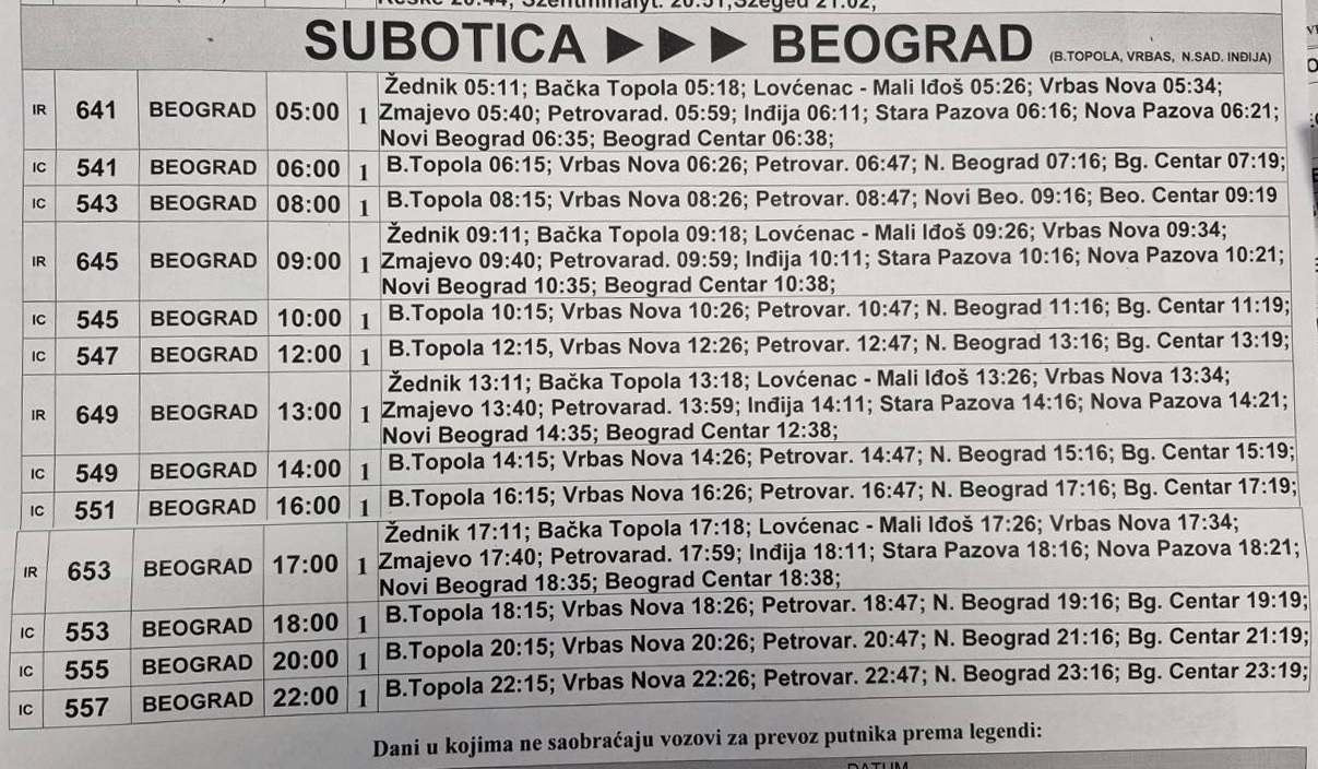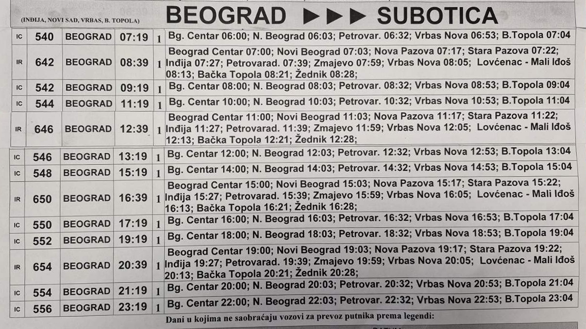 Na železničkoj stanici u Subotici ovih dana istaknut je red vožnje za novu brzu prugu ka Beogradu, a prvi brzi voz za prestonicu krenuće sutra, 8. oktobra u 12 časova. Dugo najavljivani početak putničkog saobraćaja konačno se približava, a prema istaknutom redu vožnje, novom deonicom između Subotice i Beograda vozovi će da saobraćaju sa 13 polazaka u jednom smeru, odnosno isto toliko iz pravca prestonice. Noćnih polazaka neće biti, pa će poslednji voz iz Subotice za Beograd polaziti u 22 časa, dok je prvi polazak planiran već u 5 sati ujutro.