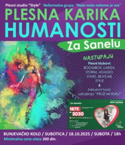 Neformalna grupa „Naše malo nekome je sve“ po drugi put organizuje manifestaciju „Plesna karika humanosti“, događaj koji spaja umetnost, emociju i solidarnost. Ove godine, sav prihod prikupljen tokom manifestacije namenjen je pomoći sugrađanki Saneli Sabo, a organizatori poručuju da će Subotica 18. oktobra 2025. godine ponovo plesati srcem.