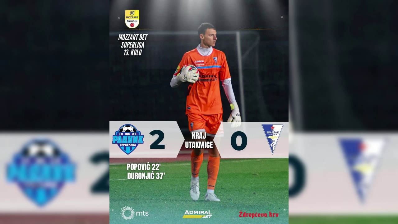 U utakmici 13. kola Mocart bet Superlige Srbije koja se igrala u subotu, 25. oktobra na Gradskom stadionu u Surdulici, fubaleri domaćeg FK “Spartak Ždrepčeva krv” izgubili su od domaćina, FK “Radnik” iz Surdulice rezultatom 0:2.