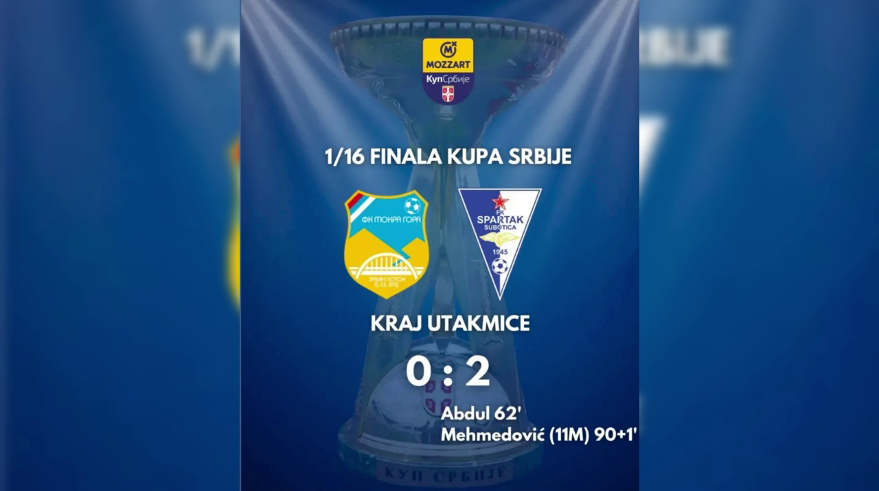 Mokra Gora je odlično otvorila meč i u prvom poluvremenu imala nekoliko ozbiljnih prilika pred golom Subotičana. Superligaš je na megdan izašao u podmlađenom sastavu, sa nekoliko debitanata, što je domaćin pokušao da iskoristi. Ipak, zahvaljujući sigurnim intervencijama mladog golmana Dimitrija Minića, mreža Spartaka je ostala netaknuta.
