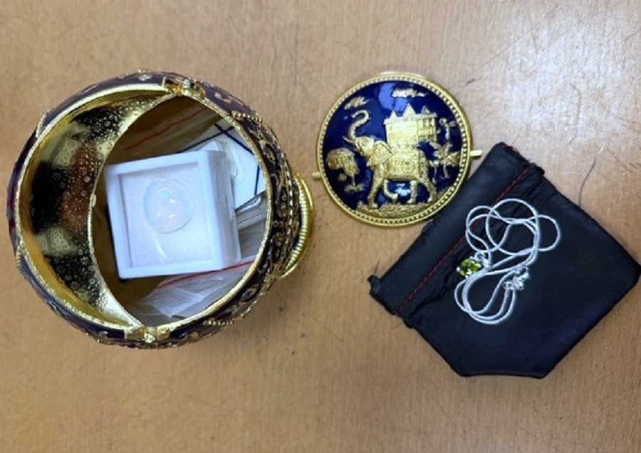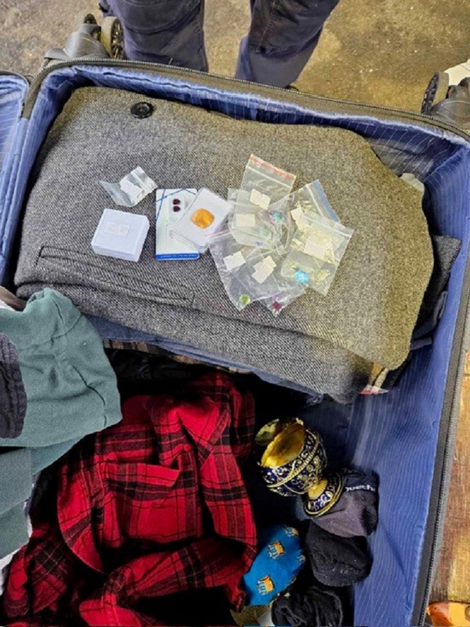 Iako je prethodno službenicima rekao da nema ništa da prijavi, detaljnom kontrolom prtljaga otkriveno je da se među njegovim ličnim stvarima krije jedna orijentalna kutijica sa 13 poludragih kamenčića među kojima su se našli: topaz, ametist, tanzanit, spinel, akvamarin, rodolit, opal i drugi.