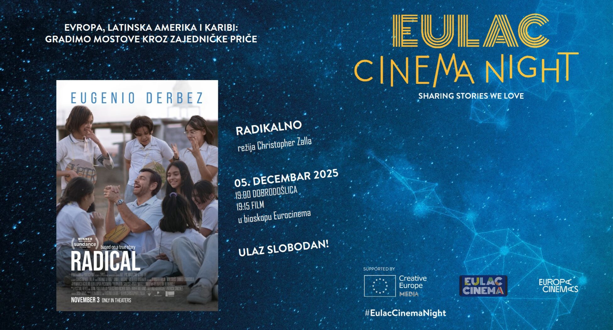 Bioskop Eurocinema je po prvi put izabran da bude domaćin globalne inicijative „Cinema Nights“ i da na ovaj način poveže subotičku publiku sa gledaocima širom sveta. Ovim povodom, sutra, 5. decembra od 19 časova, besplatno će biti prikazan nagrađivani meksički film „Radikalno“.