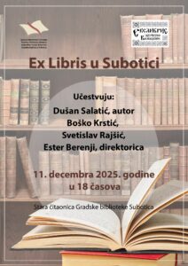 U Staroj čitaonici Gradske biblioteke Subotica, u četvrtak 11. decembra biće održan književni program „Ex Libris u Subotici“, manifestacija posvećena knjizi, autorstvu i negovanju kulturnog nasleđa grada. Događaj, koji organizuje Gradska biblioteka Subotica uz podršku Društva ljubitelja knjiga „Ex Libris“, okupiće poznate stvaraoce i kulturne radnike koji će publici predstaviti različite poglede na književnost, izdavaštvo i čitanje danas. Početak je najavljen za 18 časova.