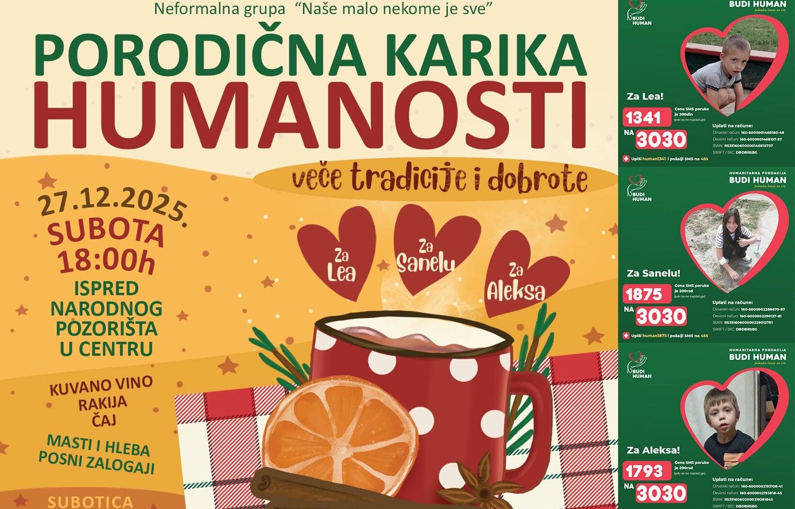 U centru grada, ispred Narodnog pozorišta, 27. decembra sa početkom u 18 časova biće održano humanitarno okupljanje pod nazivom „Porodična karika humanosti – veče tradicije i dobrote“, koje ima za cilj prikupljanje pomoći i pružanje podrške Leu, Saneli i Aleksi.