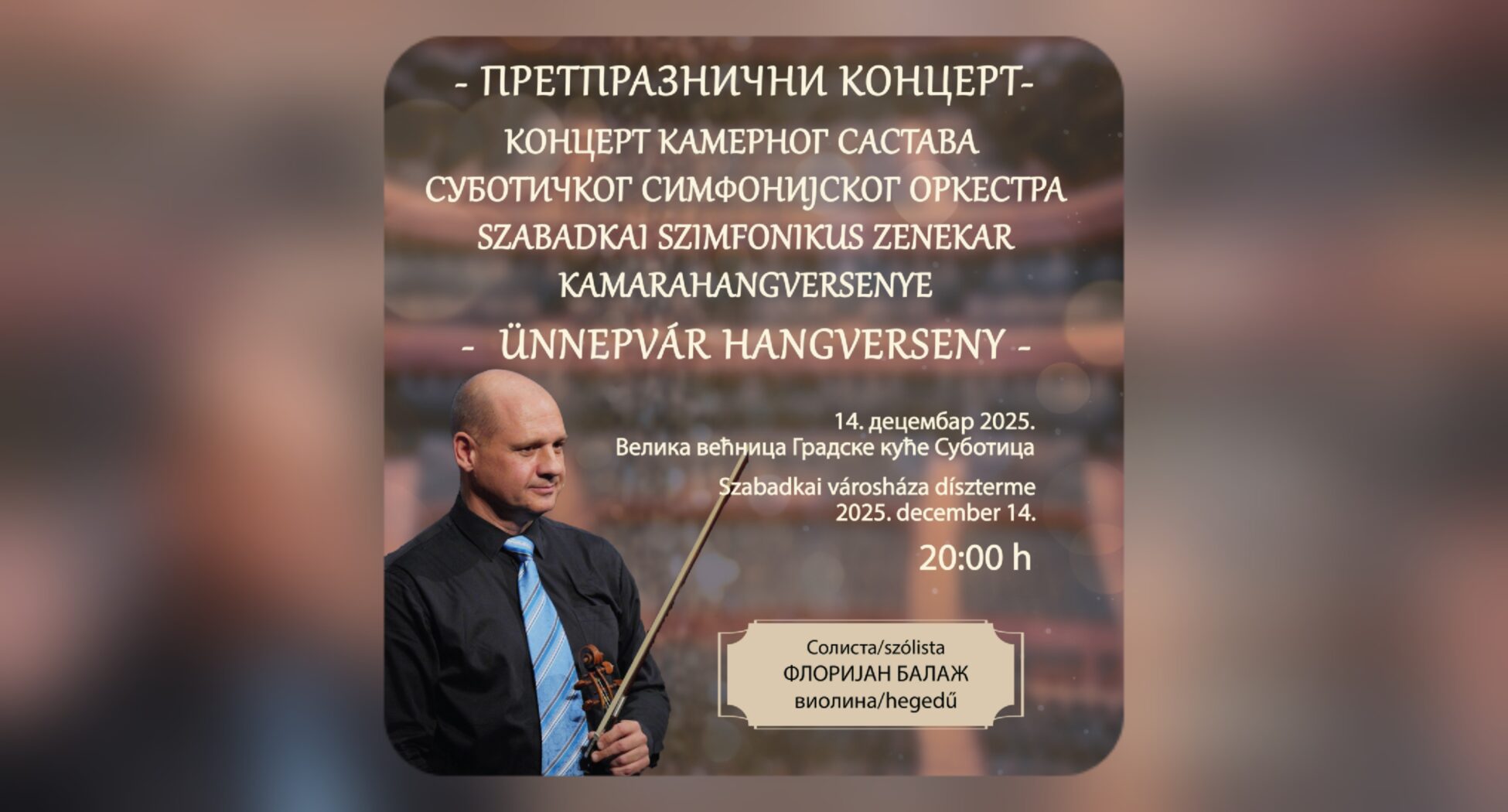 Subotički simfonijski orkestar ove godine otvara prazničnu sezonu svojim svečanim Pretprazničnim koncertom kamernog sastava, koji će se održati 14. decembra u Velikoj većnici Gradske kuće u Subotici. Početak je zakazan za 20 časova.