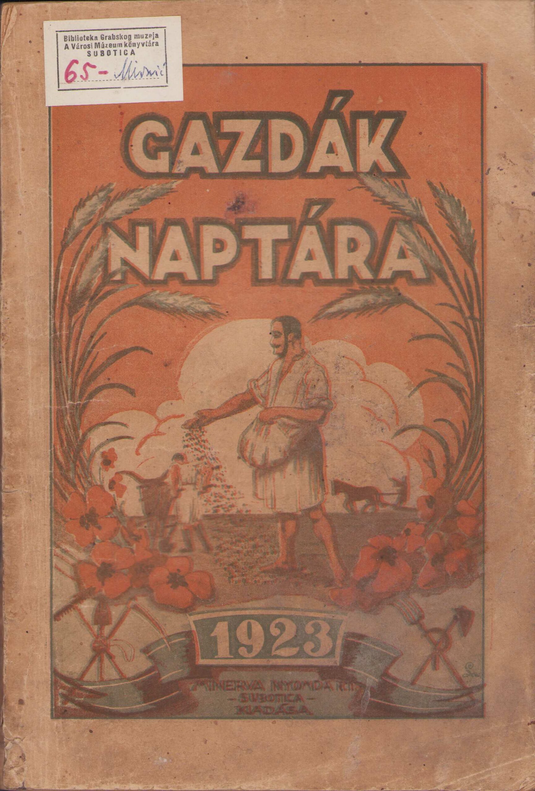 Kalendar za poljoprivrednike za 1923. godinu, sa svojih 158 strana, omogućava čitaocu da se obrazuje, kulturno uzdiže, ali i da se zabavi. Izdavač i štampar je subotička „Minerva”. Između dva rata je izdavaštvo kalendara bilo u procvatu. Naročito su u velikom broju izlazili kalendari na manjinskim jezicima. Naročito se ovo može reći za izdanja „Minerve”. Ono što čini neizbežan deo svakog kalendara je pregled dana, nedelja, meseci u godini. U kalendaru su posebno navedeni datumi po julijanskom i gregorijanskom kalendaru. U zaglavlju svakog meseca je pored astroloških oznaka i crtež sa temom koja odgovara datom mesecu: npr. za januar je izabran crtež žene koja na leđima nosi grane za loženje, u martu muškarac ore sa volovima, u decembru se deca raduju Deda Mrazu.