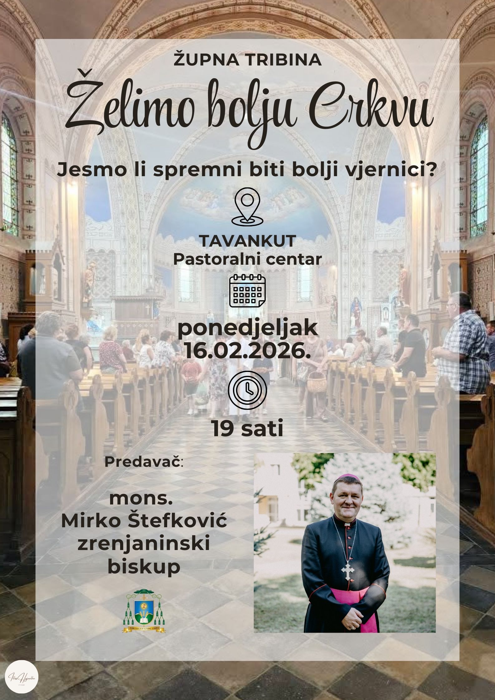 Predavanje će održati monsinjor Mirko Štefković, zrenjanjanski biskup, koji će kroz svoje izlaganje pokušati da odgovori na aktuelna pitanja sa kojima se crkva danas suočava, ali i da ukaže na značaj ličnog angažmana, autentičnog svedočenja vere i spremnosti na promene koje počinju od pojedinca. Očekuje se da će njegovo obraćanje podstaći učesnike na razmišljanje o tome kako svaki vernik može doprineti jačanju zajedništva i duhovne zrelosti crkvene zajednice.