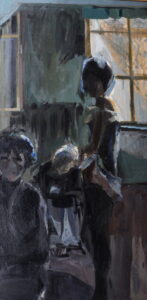 Iako po prirodi scene u enterijeru, suprotno slikanju u pleneru, slika može da navede na svedeniji i tamniji kolorit, atmosfera ove slike je izrazito hladna, za slikarku karakterističnom upotrebom tamnih boja protkanih hladno sivo-plavim ritmom. Period je to ekspanzije enformel slikarstva, čiji istaknuti predstavnik je bio slikar i pozorišni scenograf, Pal Petrik, a čemu se i slikarka priklonila u određenom momentu – kao primer navodimo Zimski pejzaž nastao 1962., danas takođe u zbirci Gradskog muzeja Subotica. Određeni postulati slikarstva materije, koji se smatra i buntom umetnika, su zadržani ili se oseća njihov uticaj, i u ovoj figuralnoj kompoziciji: nema „lepote” u klasičnom smislu, postoji trag gesta, materije i trenutka; proces nanošenja boja postaje važan faktor, materija je ovde jednako važna – npr. namerno je ostavljena boja dok curi u donjem prozorskom oknu.