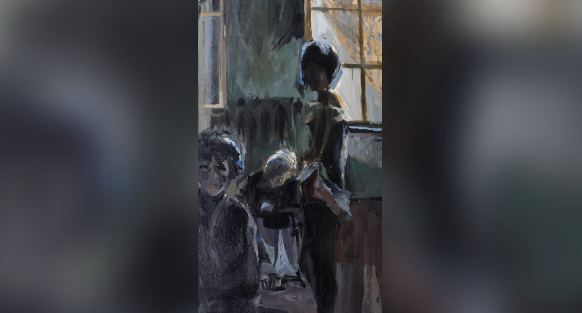 Iako po prirodi scene u enterijeru, suprotno slikanju u pleneru, slika može da navede na svedeniji i tamniji kolorit, atmosfera ove slike je izrazito hladna, za slikarku karakterističnom upotrebom tamnih boja protkanih hladno sivo-plavim ritmom. Period je to ekspanzije enformel slikarstva, čiji istaknuti predstavnik je bio slikar i pozorišni scenograf, Pal Petrik, a čemu se i slikarka priklonila u određenom momentu – kao primer navodimo Zimski pejzaž nastao 1962., danas takođe u zbirci Gradskog muzeja Subotica. Određeni postulati slikarstva materije, koji se smatra i buntom umetnika, su zadržani ili se oseća njihov uticaj, i u ovoj figuralnoj kompoziciji: nema „lepote” u klasičnom smislu, postoji trag gesta, materije i trenutka; proces nanošenja boja postaje važan faktor, materija je ovde jednako važna – npr. namerno je ostavljena boja dok curi u donjem prozorskom oknu.