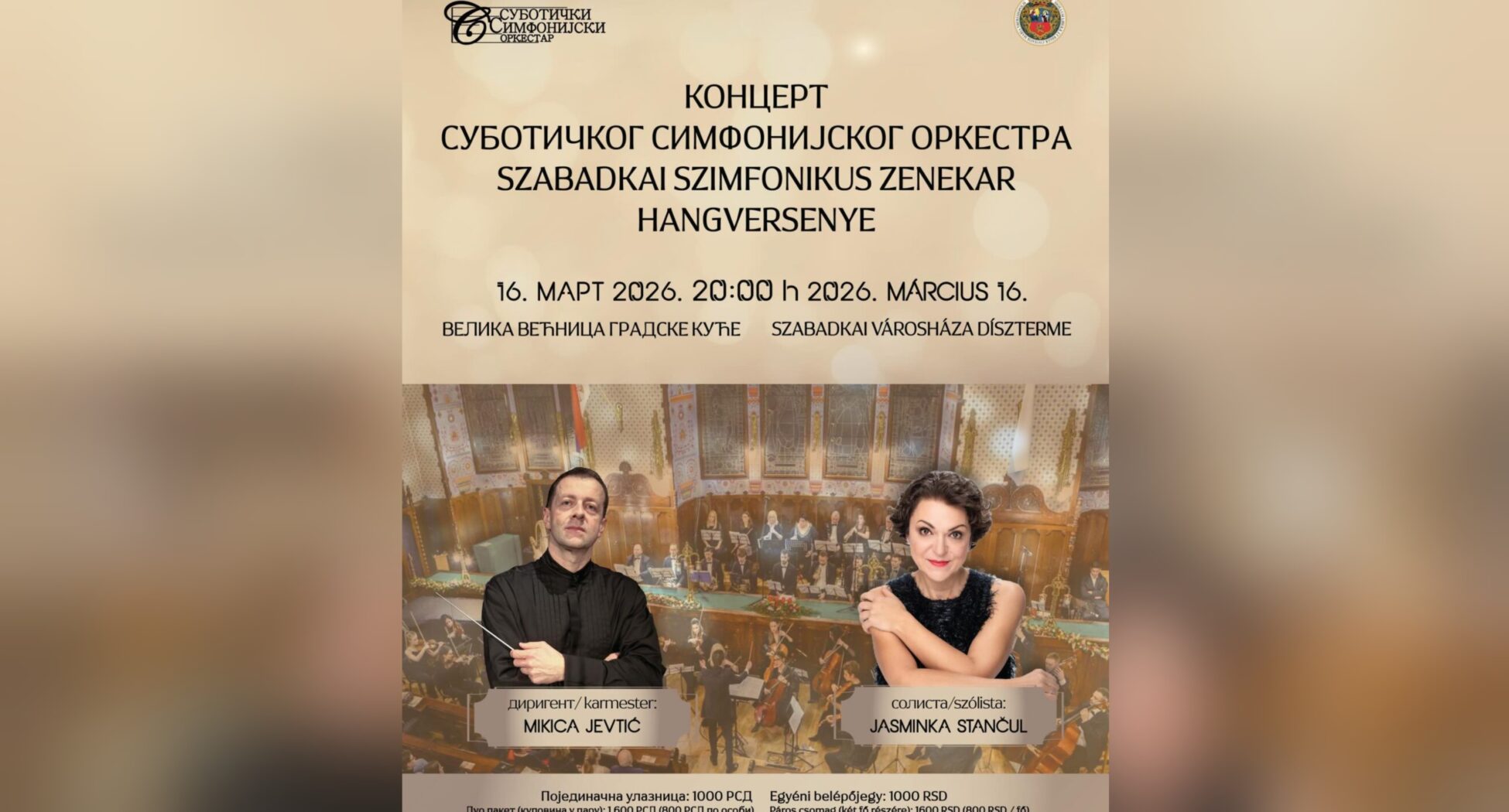 Orkestar će predvoditi dirigent Mikica Jevtić, dok će kao solistkinja nastupiti istaknuta pijanistkinja Jasminka Stančul, umetnica međunarodne karijere koja je svojim interpretacijama osvojila publiku i kritiku na brojnim svetskim scenama. Njeno gostovanje u Subotici predstavlja posebnu priliku za publiku da uživo čuje umetnicu čije je izvođenje prepoznatljivo po tehničkoj virtuoznosti i snažnom umetničkom izrazu.