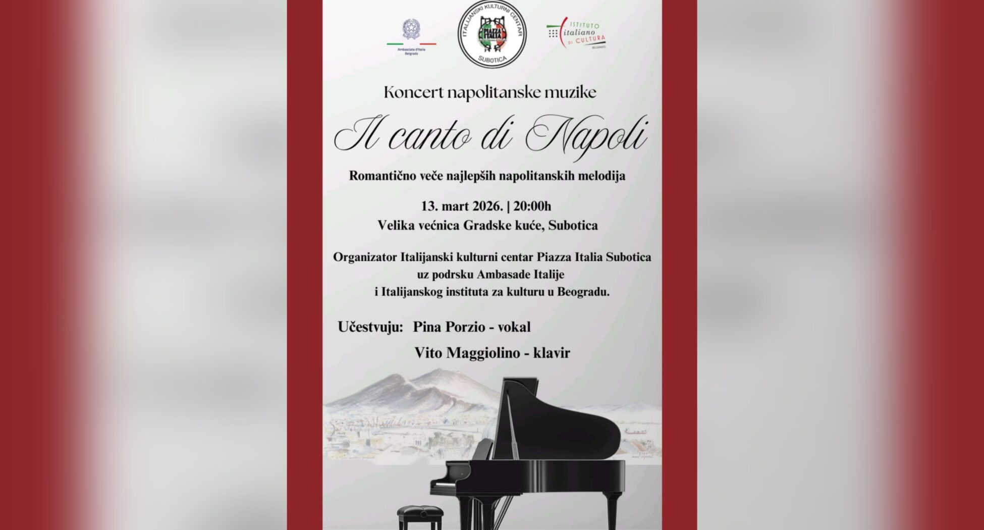 Subotička publika imaće priliku da 13. marta prisustvuje jedinstvenom muzičkom događaju koji donosi duh juga Italije u srce grada. U organizaciji Italijanskog kulturnog centra „Piazza Italia“ Subotica, a uz podršku Ambasada Italije u Srbiji i Italijanskog instituta za kulturu u Beogradu, u Velikoj većnici Gradske kuće biće održan koncert pod nazivom „Il canto di Napoli“. Početak koncerta zakazan je za 20 časova, a publiku očekuje veče ispunjeno emocijom, tradicijom i bogatim muzičkim nasleđem Napulja.