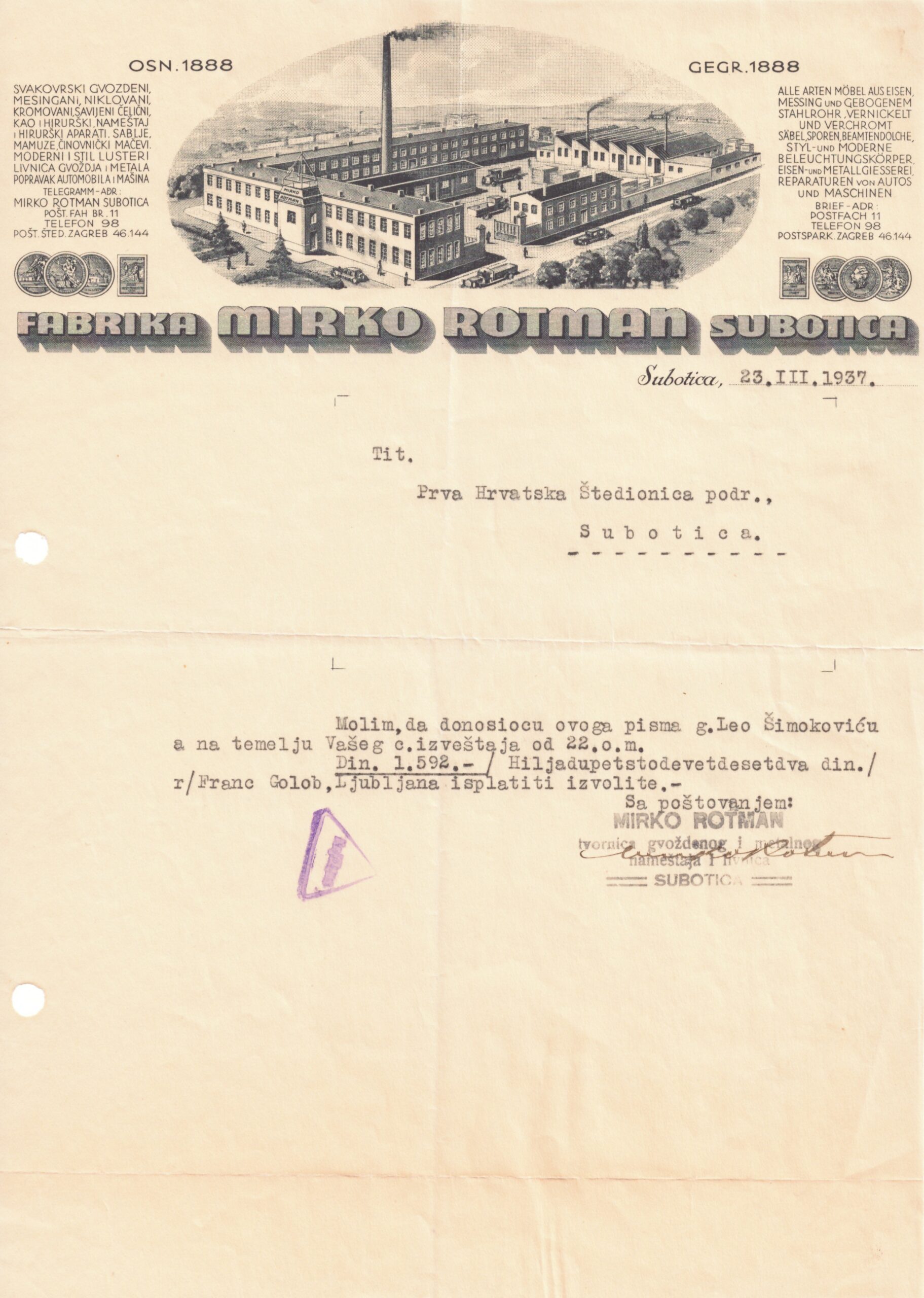 Predmet aprila Gradskog muzeja Subotica: Dopis fabrike Mirka Rotmana iz 1937 godine